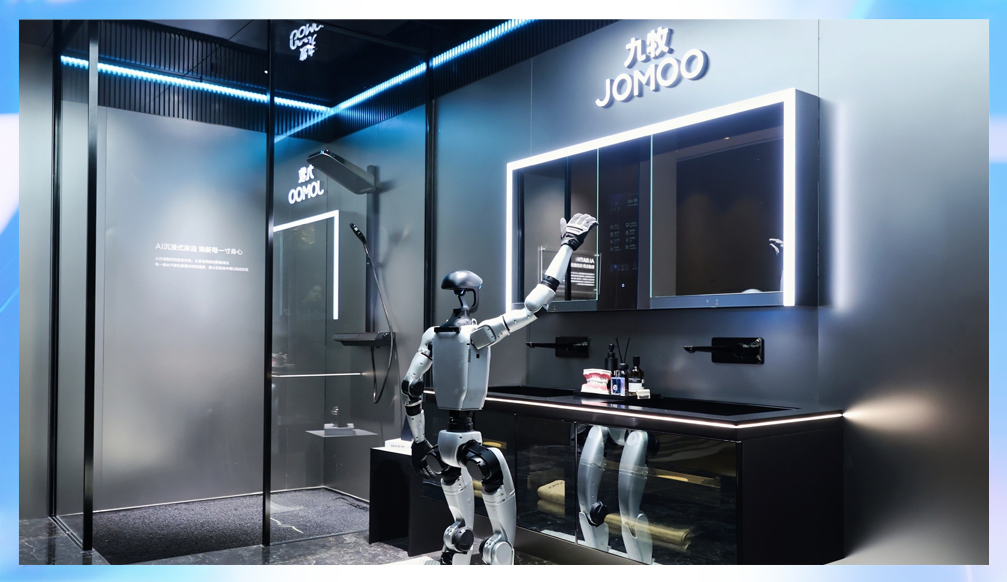 机器人在九牧AI BATH场景与浴室柜“互动”