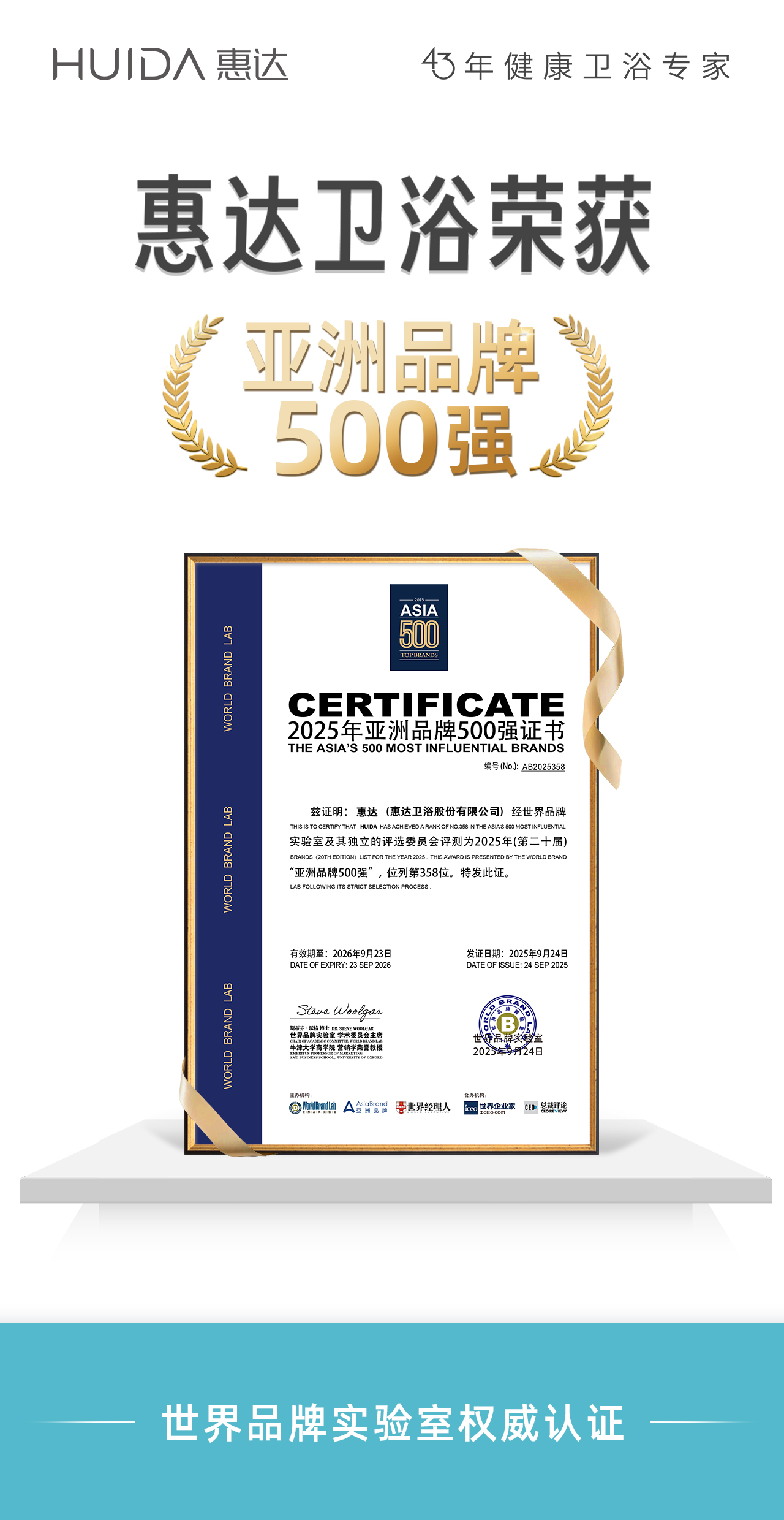 此次再度获评《亚洲品牌500强》,既是对惠达卫浴综合实力的肯定,也是对中国制造业转型升级成果的见证。展望未来,惠达卫浴将继续深化"健康卫浴专家"的品牌定位,通过智能制造、标准引领和全球化布局三大战略,不断提升品牌在国际市场的影响力和竞争力。