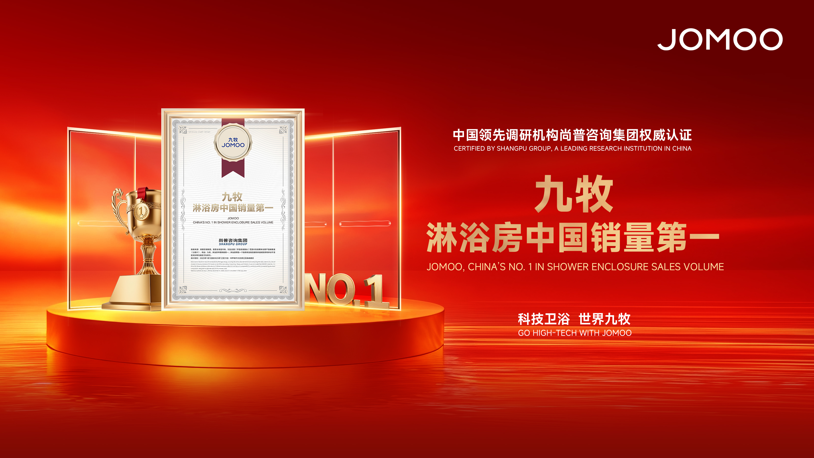 凭借领先的市场占有率、硬核技术实力与用户的高度认可,国际权威调研机构——尚普咨询正式认证,“九牧淋浴房中国销量第一”。