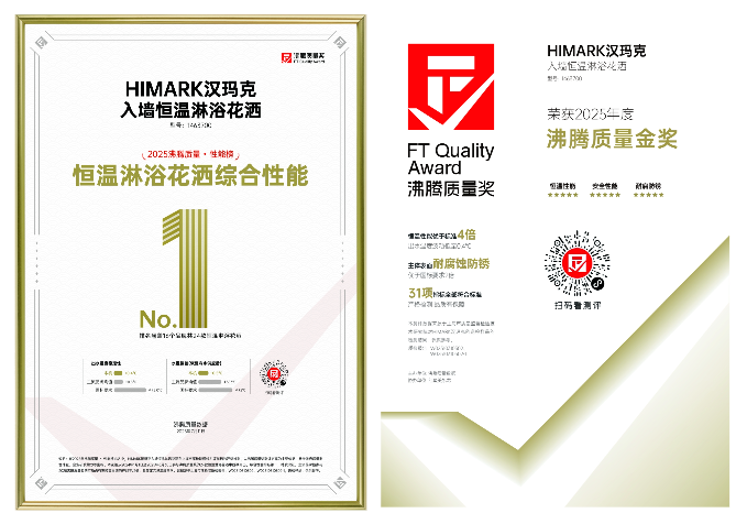 “0.1秒恒温极速响应,洗澡不再忽冷忽热”。汉玛克自主研发的“潜龙800”恒温阀芯采用镍钛合金材质,实现0.1秒极速响应,水温波动控制在±0.4℃以内,经国家检测中心对比16个主流品牌24款恒温产品,在关键性能上远超主流品牌,一举斩获沸腾质量金奖NO1。