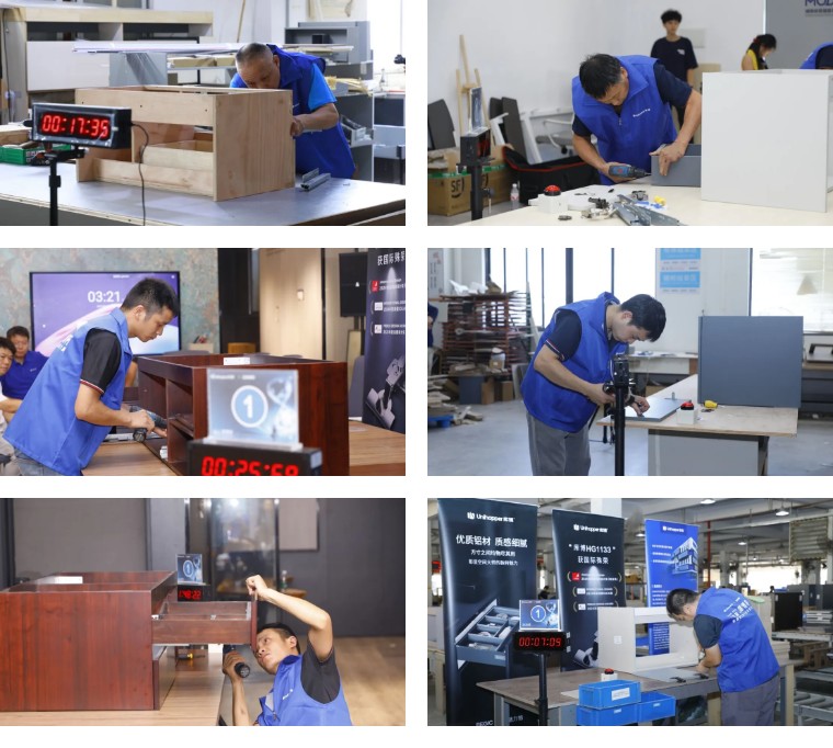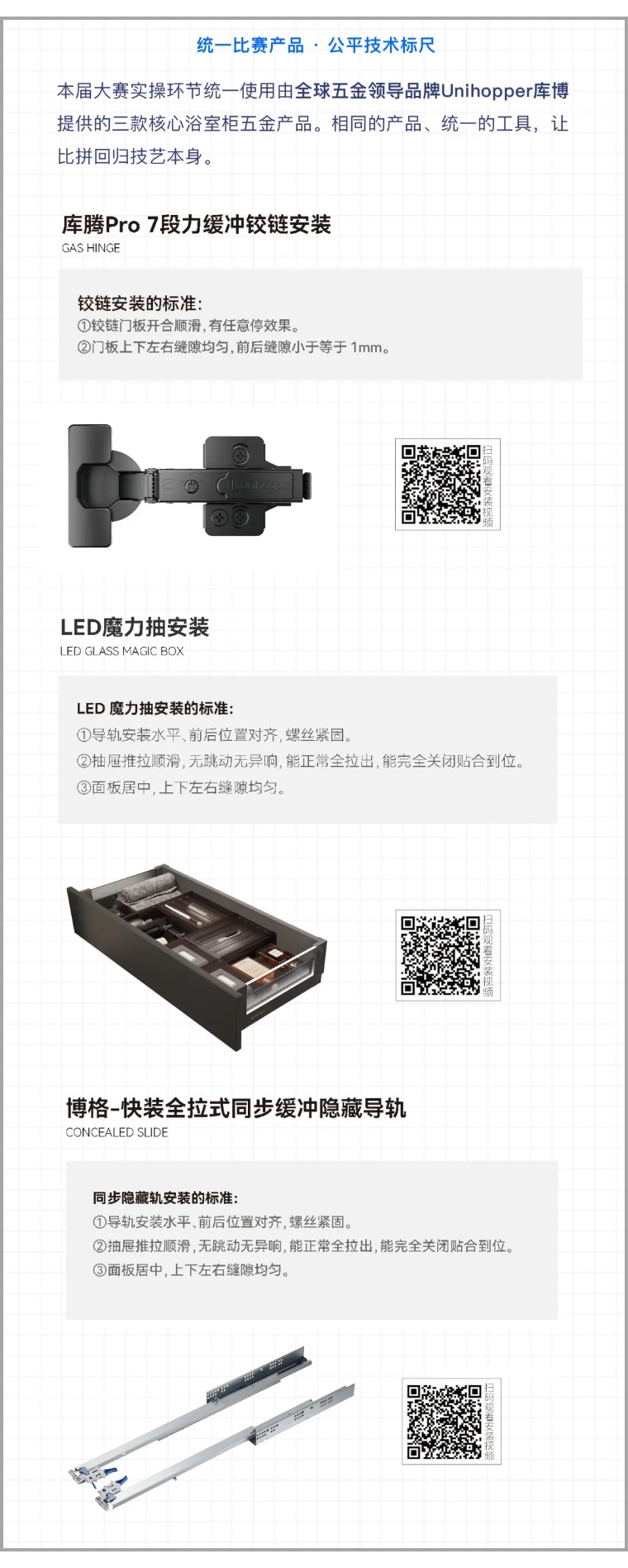 大赛选择由大赛组委会提供的「Unihopper库博」五金产品—骑马抽、滑轨、铰链作为竞技产品,这三种常见的五金件,直接影响浴室柜的使用体验。安装是否水平、阻尼是否顺滑、承重是否达标,都要求工匠对产品原理有深刻理解。