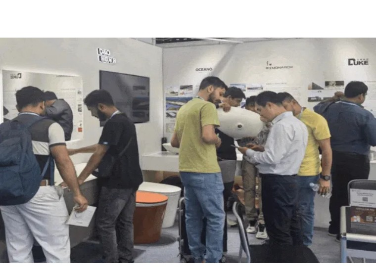 帝王洁具展位吸引国际客户驻足,现场体验产品设计与性能