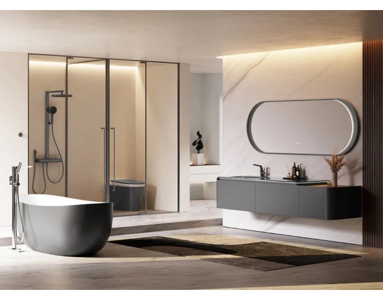 穹宇浴室柜:采用船型大盆设计,结合公爵亚克力一体成型技术与双色无缝拼接工艺,实现台盆与柜体色彩的自然过渡,适配现代轻奢、极简等多种家居风格,展现亚克力材料在造型与美学上的无限可能。