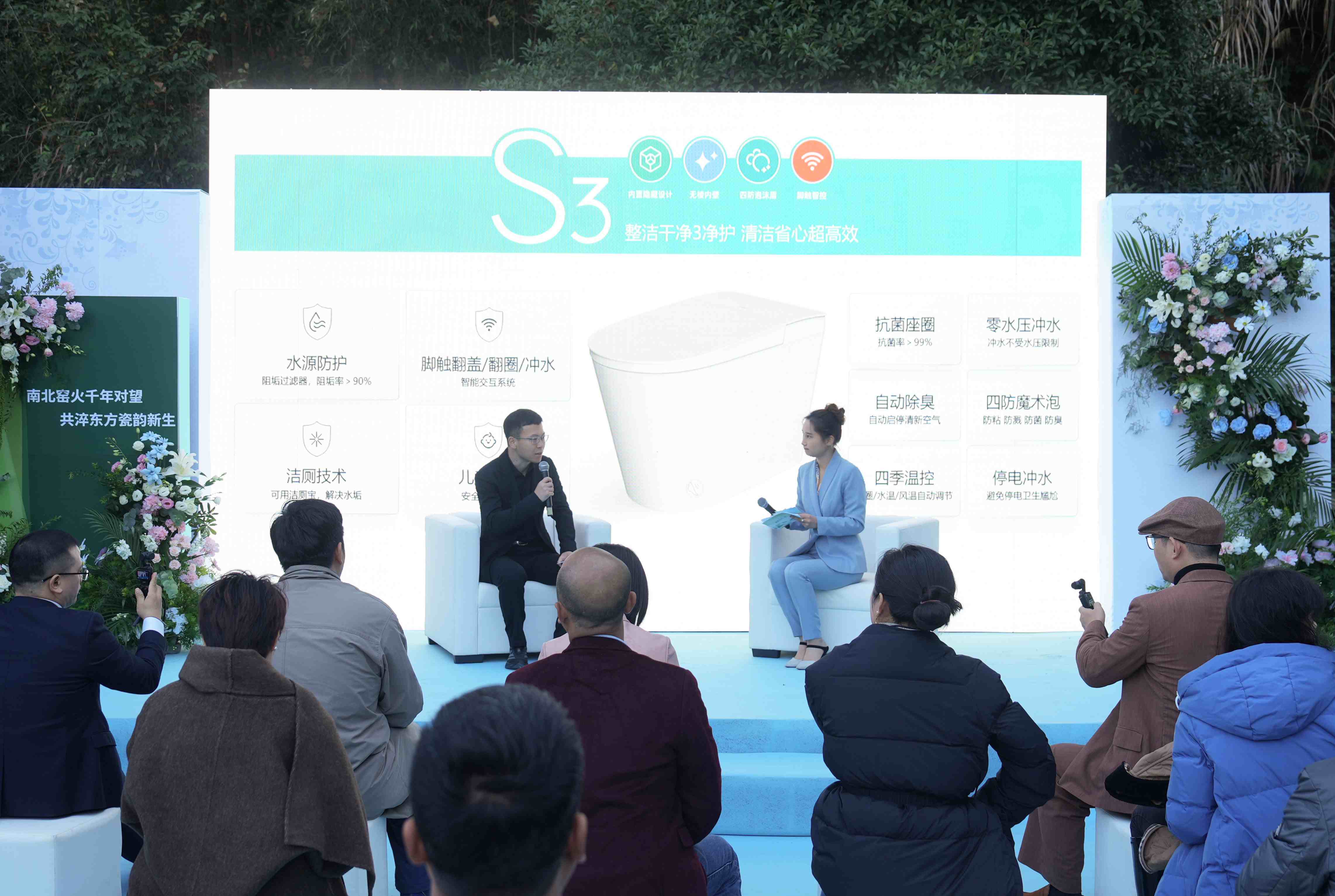 惠达卫浴国内业务中心总经理赵彦明先生揭幕 “深盾 S3” 智能马桶新品。据介绍,该产品融合惠达在健康卫浴领域的技术积累 ——采用无棱内壁设计,内置阻垢净滤器和四防魔术泡,以及“蓝宝宝”洁厕技术,其设计灵感源自传统陶瓷的 “洁净基因”,实现 “传统工艺内核 + 现代科技外壳” 的创新结合,成为本次文化节 “文化落地产业” 的具象载体。