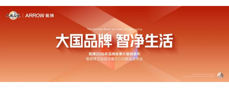 2026年4月20日,正值佛山潭洲陶瓷展开幕首日,箭牌家居以“大国品牌·智净生活”——大国品牌故事片首映发布暨2026箭牌新品发布会为主题,在展会现场举办了箭牌2026品牌故事片《再好一点》首发仪式,并同步发布箭牌卫浴D30自洁魔方。央视《大国品牌》联合出品人匡洪生、大国品牌创意总监王昂杨、《陶城报》社长、佛山潭洲陶瓷展总经理李新良,中国建筑卫生陶瓷协会秘书长朱保花、中国建筑材料流通协会副会长兼陶卫经销商委主席李作奇、中国建材市场协会卫浴分会,佛山市卫浴洁具行业协会执行会长兼秘书长刘文贵、环球网家居华南负责人李家燕、与箭牌家居集团董事长、总经理谢岳荣、箭牌家居集团集团副总经理霍秋洁、箭牌家居集团副总经理兼董秘杨伟华、箭牌家居集团副总经理卢金辉、箭牌卫浴事业部总经理贾冬启以及来自全国的经销商与媒体代表共同出席。