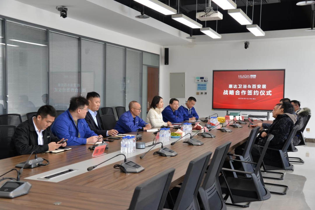 3月31日,百安居中国CEO吴笃卿一行到访惠达总部,惠达卫浴总裁王佳进行热情接待,双方就2025年的合作事项进行深入探讨,并签订年度战略合作协议。