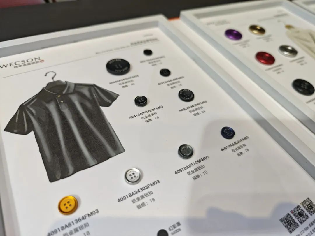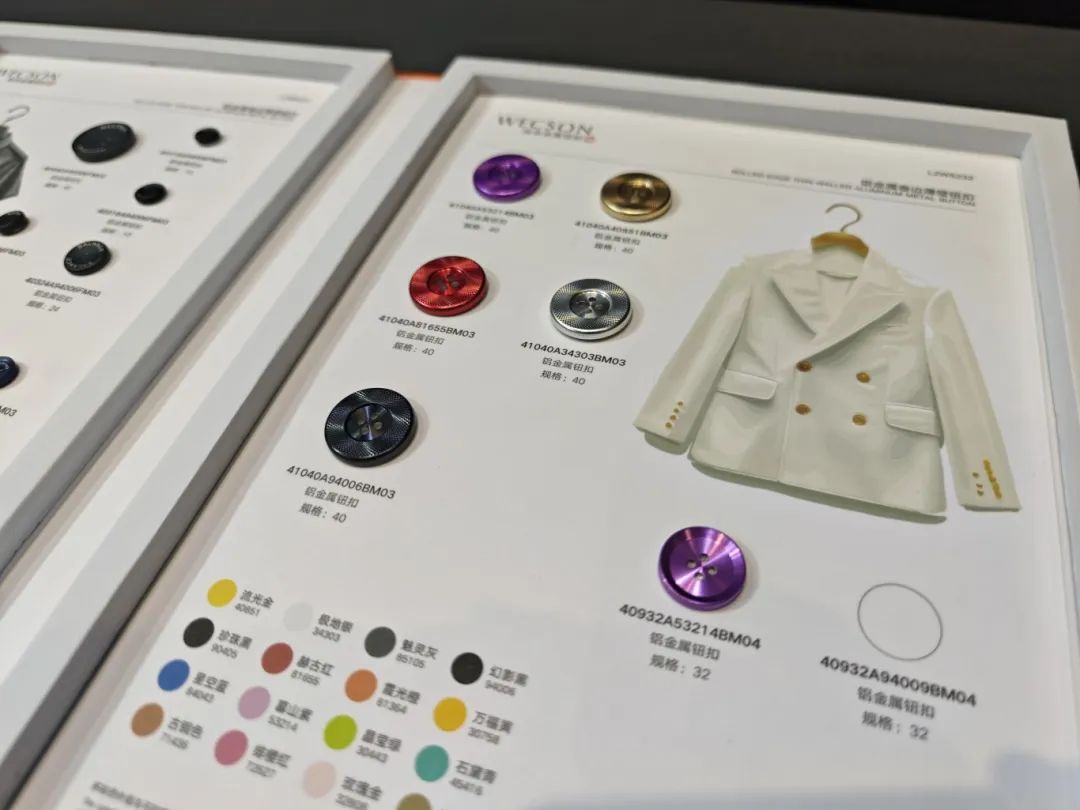 丰富详尽的应用展示图册,让参观者更直观感受到纬申钮扣的魅力。隽雅多彩的色系经过前期多次平衡与选择,在给人带来视觉冲击的同时,又不喧宾夺主,不掩服装本身之美。