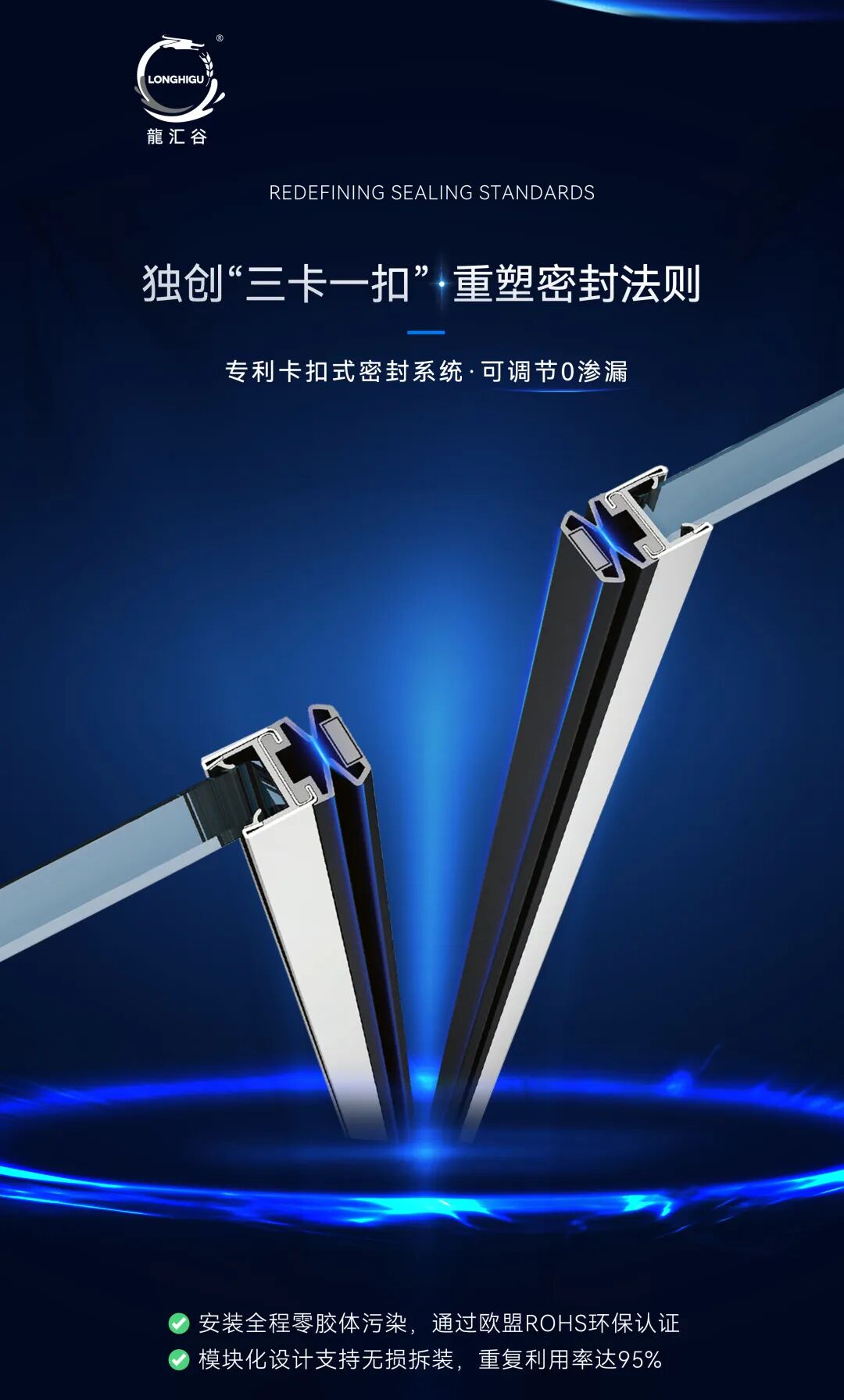 龍汇谷免胶不锈钢型材行业首创的免胶技术,在我看来是真正的颠覆性突破。专利卡扣式密封系统,彻底摒弃了打胶工艺,实现全程零胶体污染,还通过欧盟RoHS环保认证、LEED绿色建材认证。这一点对客户的赋能尤为关键,尤其是做出口业务的企业,有了这个认证,就能顺利进入对环保要求严苛的欧洲市场。
