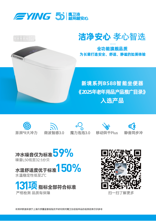 随着老龄化社会加速到来,适老化家居产品已成刚需。本届展会特设“银潮新主义·未来适老”主题展区,鹰卫浴BS88智能马桶凭借突出的适老化创新,成功入选国家工信部老年用品产品推广目录。这一国家级背书,不仅印证了产品的技术领先性,更标志着鹰卫浴在银发赛道取得里程碑式成果。