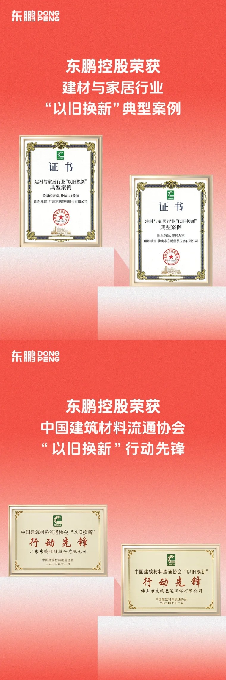 东鹏“焕新轻奢家,补贴1:1叠加”与“旧卫换新,惠民万家”入选全国建材与家居行业“以旧换新”典型案例,并荣获“行动先锋”称号。