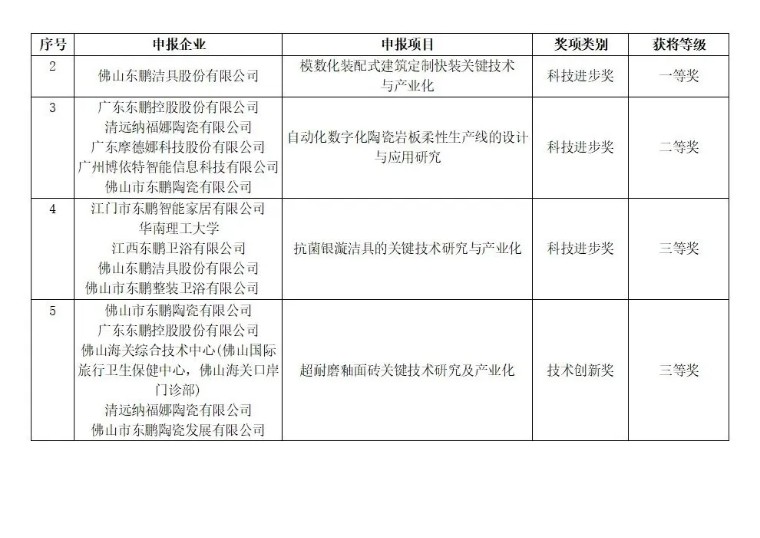 为深入贯彻党的创新驱动发展战略,中国建筑材料流通协会对在推动我国建材家居、装饰装修、建筑施工等全产业链领域科学技术进步工作中做出突出贡献的科技人员和单位进行了表彰。东鹏凭借卓越的科技创新实力,荣获多项殊荣。其中,“模数化装配式建筑定制快装关键技术与产业化”项目荣获科技进步奖一等奖,“自动化数字化陶瓷岩板柔性生产线的设计与应用研究”项目荣获二等奖,“抗菌银漩洁具的关键技术研究与产业化”项目荣获三等奖。“超耐磨釉面砖关键技术研究及产业化”项目荣获技术创新三等奖。