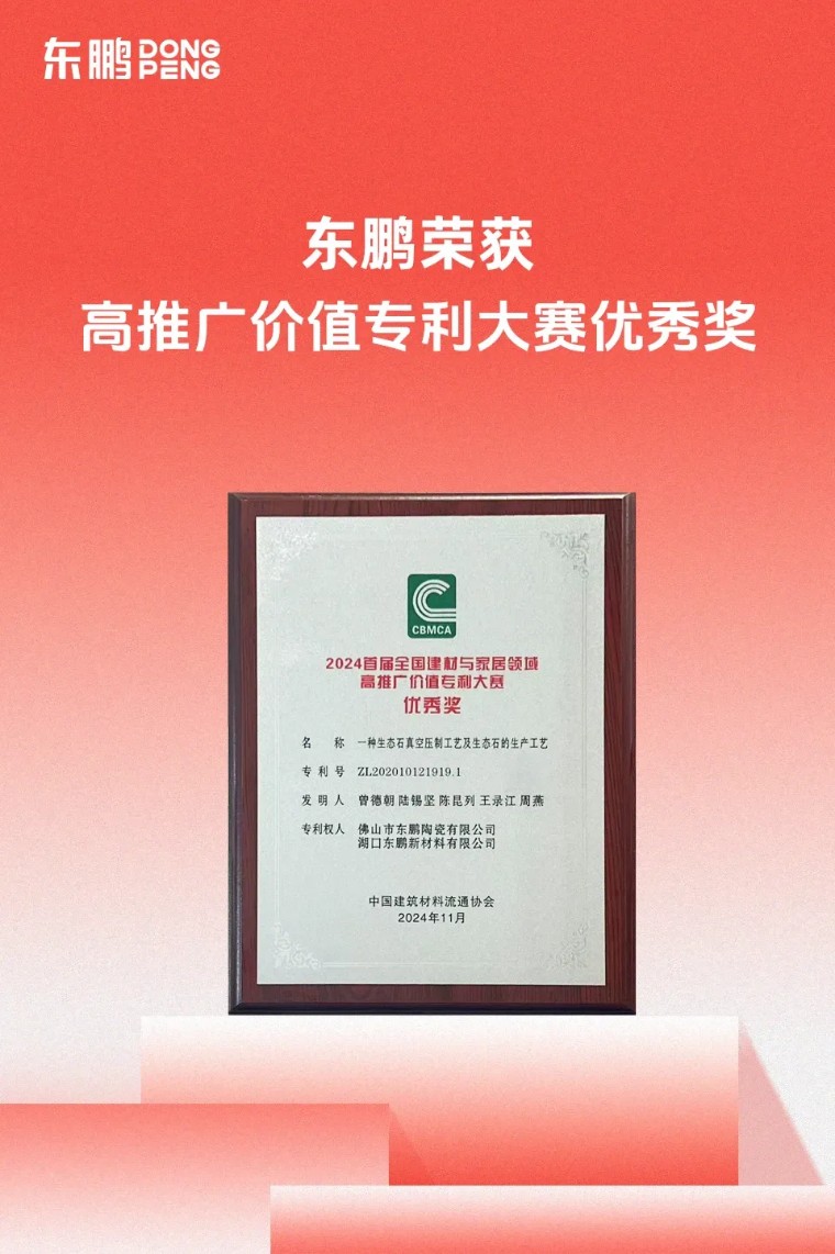为激发我国建材与家居领域创新活力,提升企业知识产权创造、运用、保护和管理水平,挖掘、培育和推介一批易转化、实用性强和推广价值高的专利,中国建筑材料流通协会举办了首届建材与家居全产业(包含建材家居、装饰装修、建筑施工等)领域高推广价值专利大赛。东鹏“一种生态石真空压制工艺及生态石的生产工艺”项目荣获高推广价值专利优秀奖,进一步证明了东鹏在知识产权创造、运用、保护和管理方面的卓越成就。