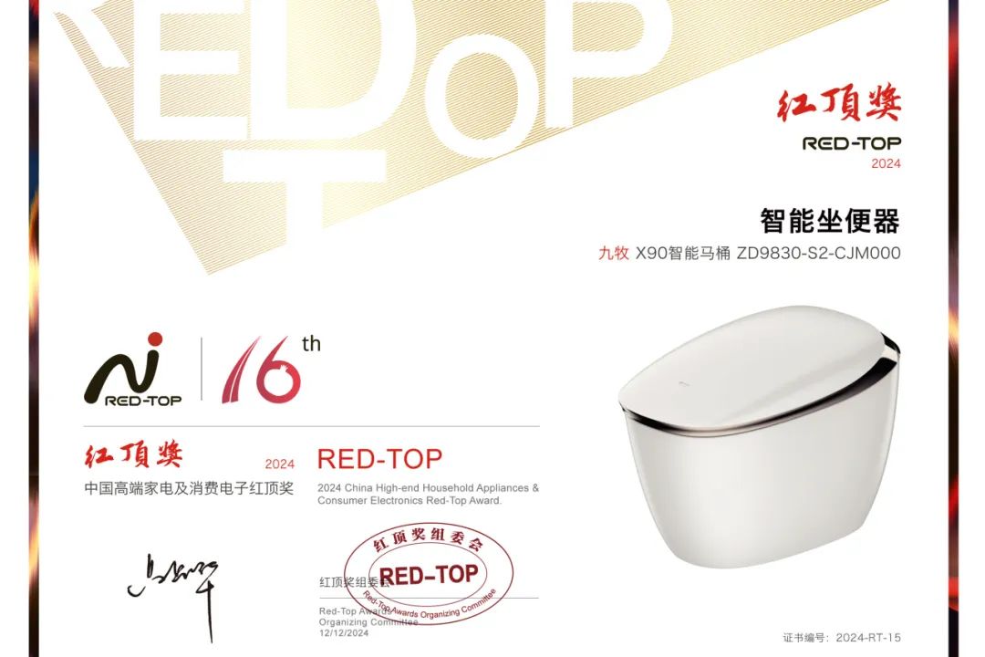 12月12日,由中国家用电器协会指导、红顶奖组委会主办的第16届中国高端家电趋势发布暨红顶奖颁奖盛典在中国油画院美地艺术中心盛大开幕,九牧X90超静音数智马桶斩获“中国高端家电红顶奖”,这也是智能马桶品类中唯一获奖的产品,与美的、索尼、西门子等品牌明星产品同台入选。