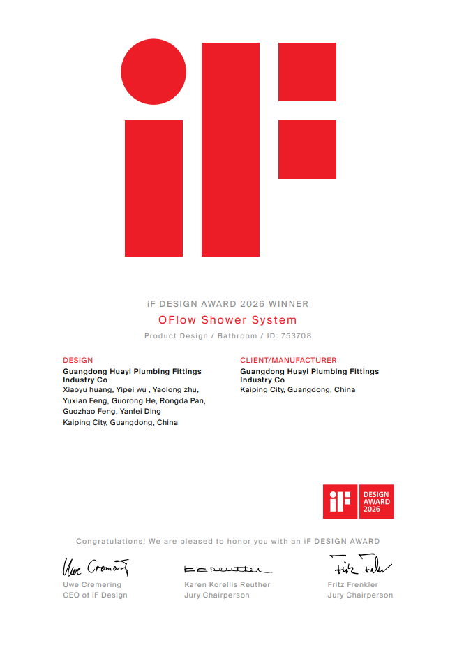 正是这份对设计与创新的不懈坚持,让华艺成功斩获2026年德国iF设计大奖。载誉前行,初心不改。未来,华艺卫浴将持续加强研发实力,以科技创新为驱动,致力推动全球消费者迈向更高品质的卫浴空间体验!